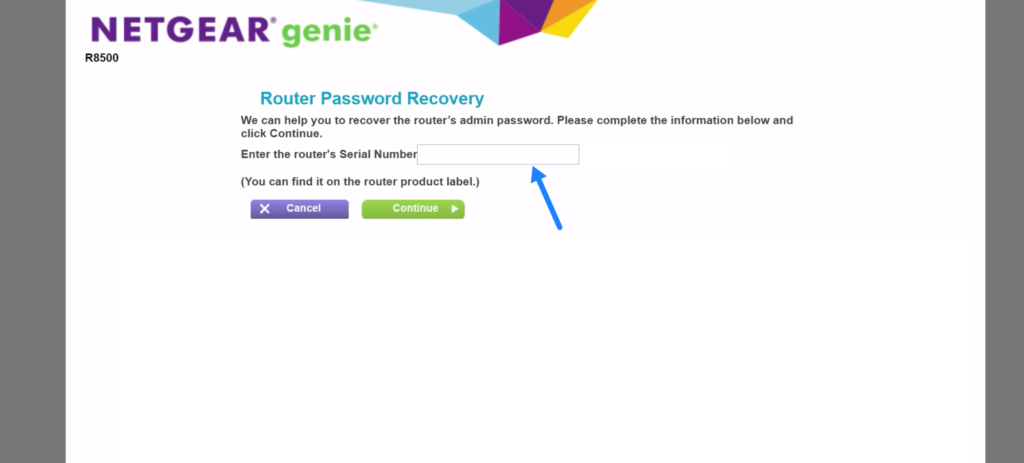 4,如果启用了密码恢复,则将提示您输入路由器的序列号,该序列号可以在路由器后面找到。 5,输入路由器的序列号,然后单击继续。