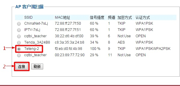 3、在扫描结果中,找到主路由器的WiFi信号名称(本例是:Teteng-2)——>点击“连接”