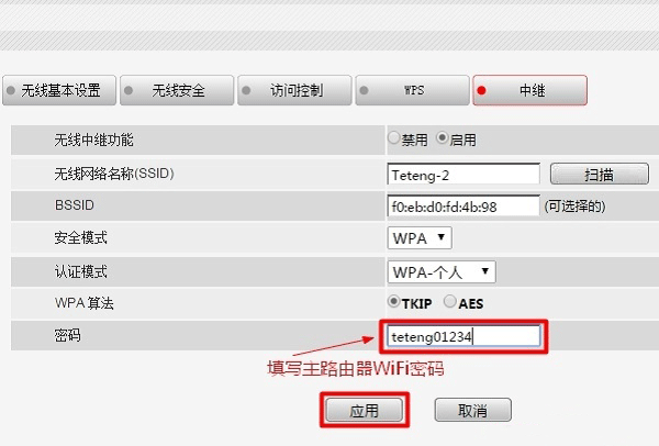 4、在“密码”选项中输入主路由器WiFi的连接密码——>点击“应用”