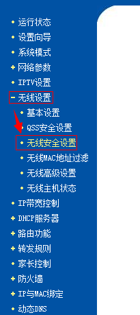点击”无线设置“前面的加号,展开菜单,选择”无线安全设置“。