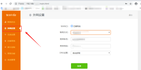 4)选择联网方式为“宽带拨号”,接着输入宽带账号和密码,点击连接